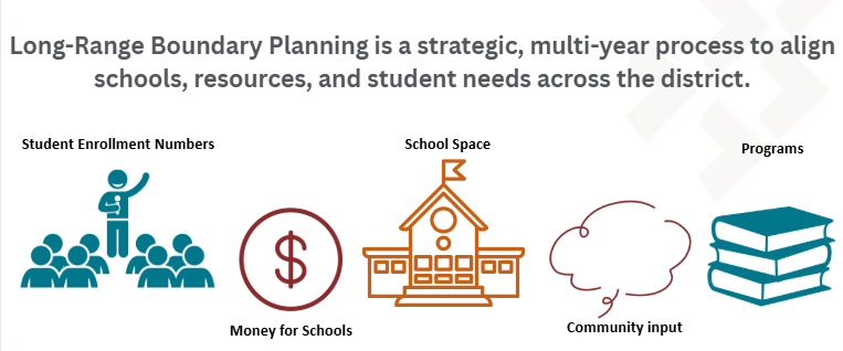 We are working to balance enrollment across the district.  In the process, we use student enrollment data, enrollment projections, school capacity, financial information, information about academic program placement, advisement from the School Boundary Advisory Committee (SBAC), and feedback from the community to determine final boundary recommendations for Board consideration.