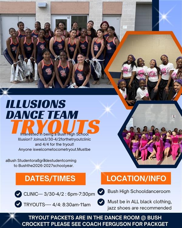 The Illusions Dance Team will be holding auditions for the 2026 - 2027 team on Saturday, April 4th 2026, from 9 - 11am. The auditions will take place at George Bush High School in the big gym.
