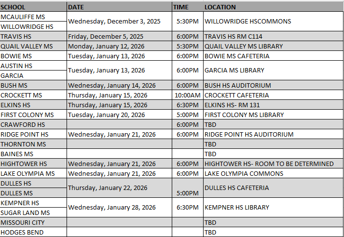Join us as Fort Bend ISD AVID Program Sites partner to host our Information Nights at a campus near you.