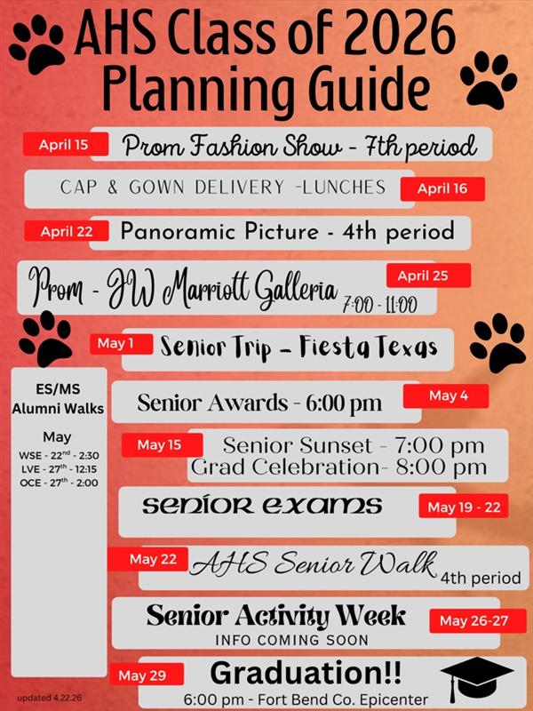 • 5/22: Senior Walk (4th period)