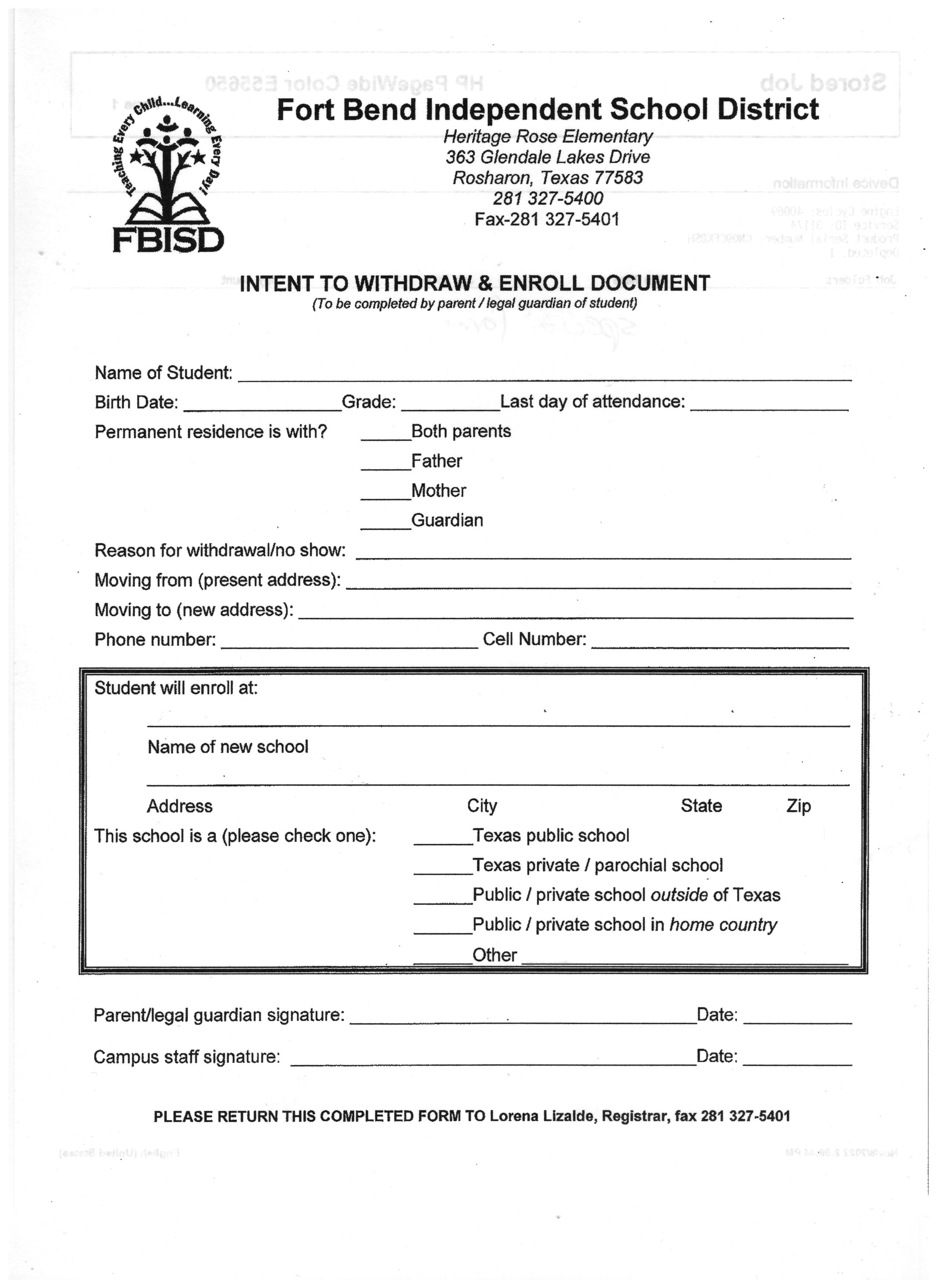 This form must be delivered to the front office when there is an Intent to Withdraw or Enroll a student at Heritage Rose Elementary.